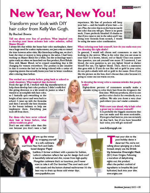 Don’t miss my latest beauty feature in the January issue of New York Resident, on newsstands now. In it, I interview Kelly Van Gogh about her latest line of at-home hair color products, called Master Blend. Also, read about Payal Luthra‘s beautiful scarves and the Drink Up Intensive Overnight Mask from Origins, the perfect cure for dehydrated skin!